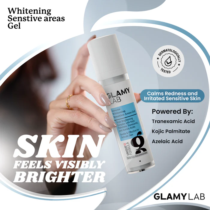 Glamy Lab Whitening Sensitive Areas Gel combines Kojic Palmitate, Tranexamic Acid, and Azelaic Acid to brighten dark spots and even your glow. It’s gentle enough for sensitive areas and works great for post-laser brightening and calming. Plus, it helps reduce redness and smooth delicate skin for a healthier, radiant feel.